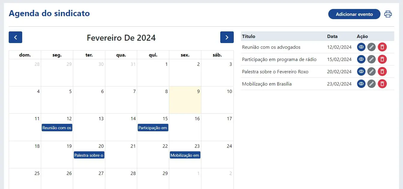 Controle todos os eventos que serão realizados pelo sindicato, gere relatórios impressos por período de realização dos eventos da agenda.