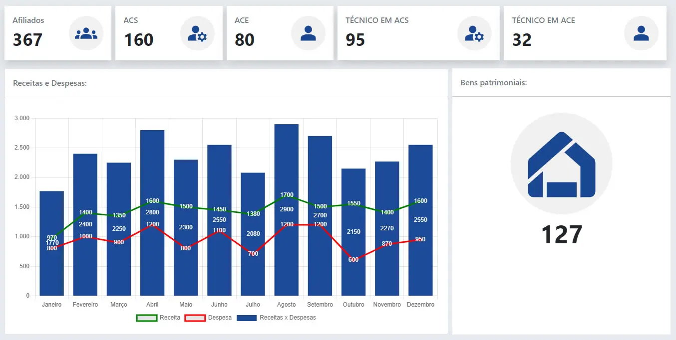 Além disso o painel exibe gráficos de por receitas/despesas cadastrar no ano corrente e o total de bens móveis registrados.