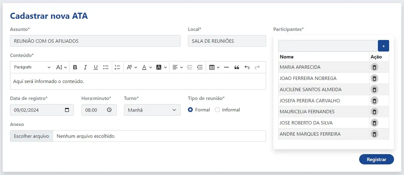 Além disso, o sistema permite cadastrar todos os funcionários que atuam no sindicato ou associação, independente de ser cargo técnico ou não.