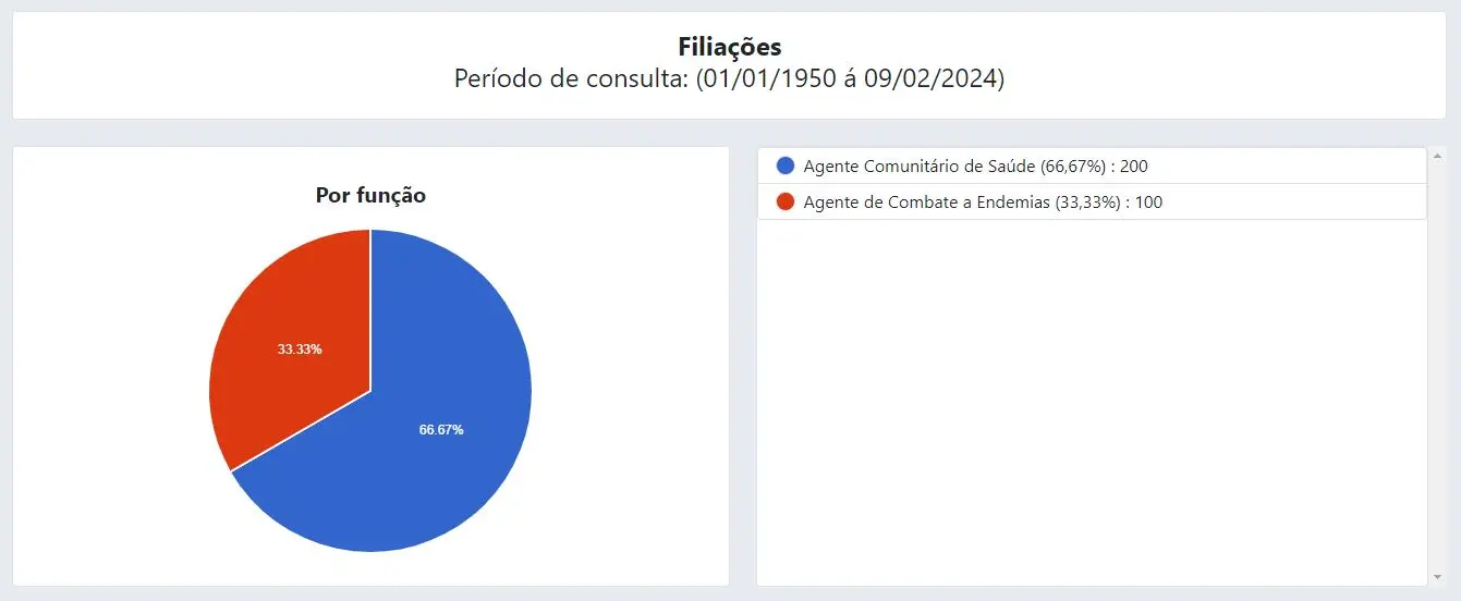 Painel de controle moderno, apresentando cards intuitivos com o total de afiliados, quantitativos de agente comunitários de saúde, total de agentes de combates às endemias, total de técnicos em agente comunitário de saúde e total de técnicos em agente de combates às endemias.